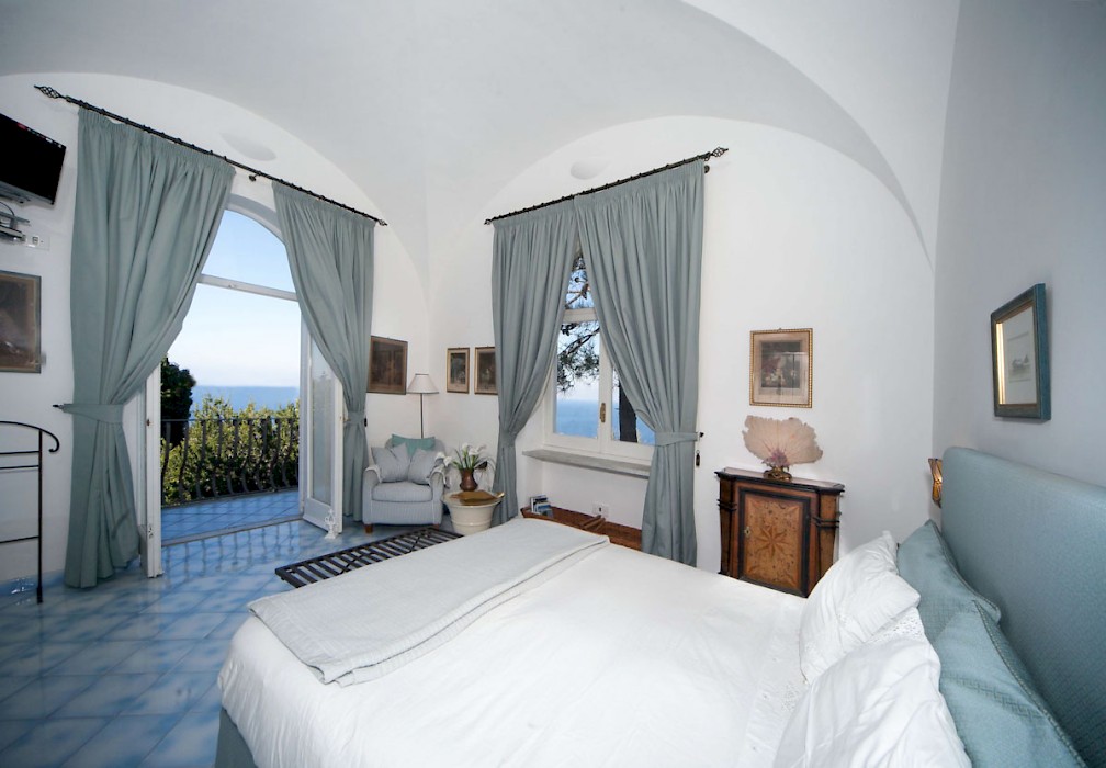 The doorway from the sitting room opens onto a large whitewashed terrace furnished with sofas and tables with seating for up to 10, perfect for lounging and dining al fresco. Small outdoor courtyard. Private circular, partially above ground pool is positioned among a garden of trees and laurels and looks out onto the bay and Mt. Vesuvius.