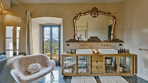 The property today is an interior designer's dream with modern fittings and a marvellously eclectic selection of top quality art, décor and furnishings. The accommodation is comfortably spread out over the main house and the magnificent tower. It sleeps 11 + 4 guests in five double bedrooms, one of which has a bunk bed, which would be ideal for a child. The master bedroom is in the main house and features a luxurious en suite bathroom, a dressing area and a terrace. The other double bedroom in the main house also has an en suite bathroom.
