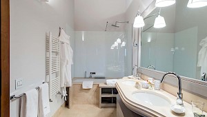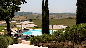 The house dates back to the 18th century, and its stonework has been recently beautifully restored in keeping with traditional local architecture. Inside, imposing arches, beamed ceilings and terracotta tiles enhance the feeling of an authentic Tuscan property. Luxuriously furnished with an elegant mix of antique and modern pieces, the rooms are finished with warm rugs and beautiful paintings. There is an impressive open-plan living/dining room with original fireplace, comfy sofas and a long wooden table that seats up to 18. The state-of-the-art kitchen gives the chef (or indeed any guests wishing to cook) all that is needed to prepare the most delicious dishes for small and large groups. The villa has 9 large, comfortable bedrooms: 7 are in the main house and 2 in the adjacent annex, all with luxury, en-suite bathrooms, large-screen wall-mounted TVs, fireplaces and spacious built-in wardrobes. Each bedroom is unique with stunning views of the valleys beyond. The 11 hectares//27.5 acres of land have been divided into several elegant sitting and dining areas from which you can enjoy the views to Pienza, the famous Mount Amiata and beyond. The spaces are lavishly furnished with lounging sofas, comfortable chairs as well as hammocks from which you can relax, read or take a snooze after the most delicious meals produced by the resident chef. Leaving the avenue lined by magnificent cypress trees interlaced with white roses and olive trees you pass by the working vineyards and arrive at the orchards in front of the villa. Walking underneath the rose-twined pergola, you arrive at the well-designed vegetable garden. The villa is part of a farm that produces extra virgin olive oil of superior quality and an excellent wine. Pienza is just a short drive away, famous for its pecorino cheese; tastings and demonstrations on how it is produced can be organized in local farms.