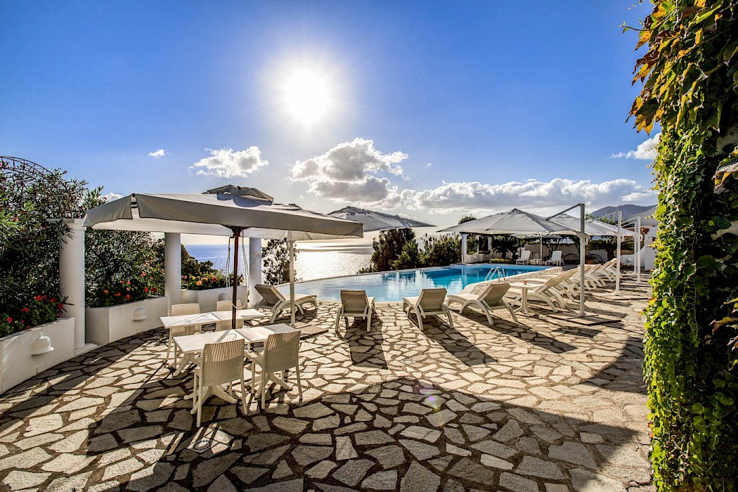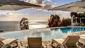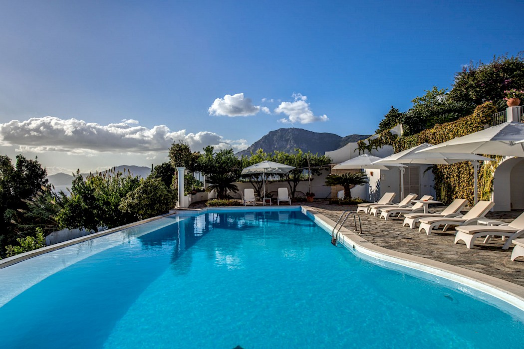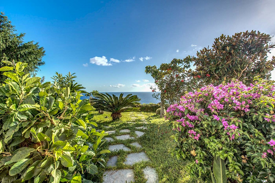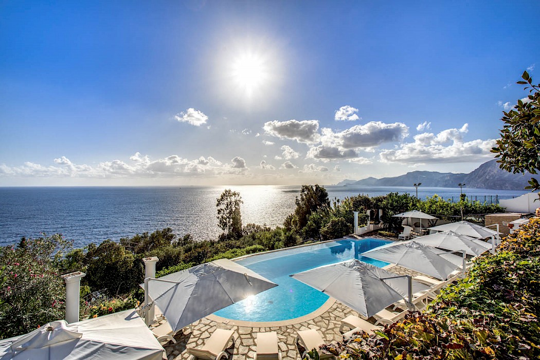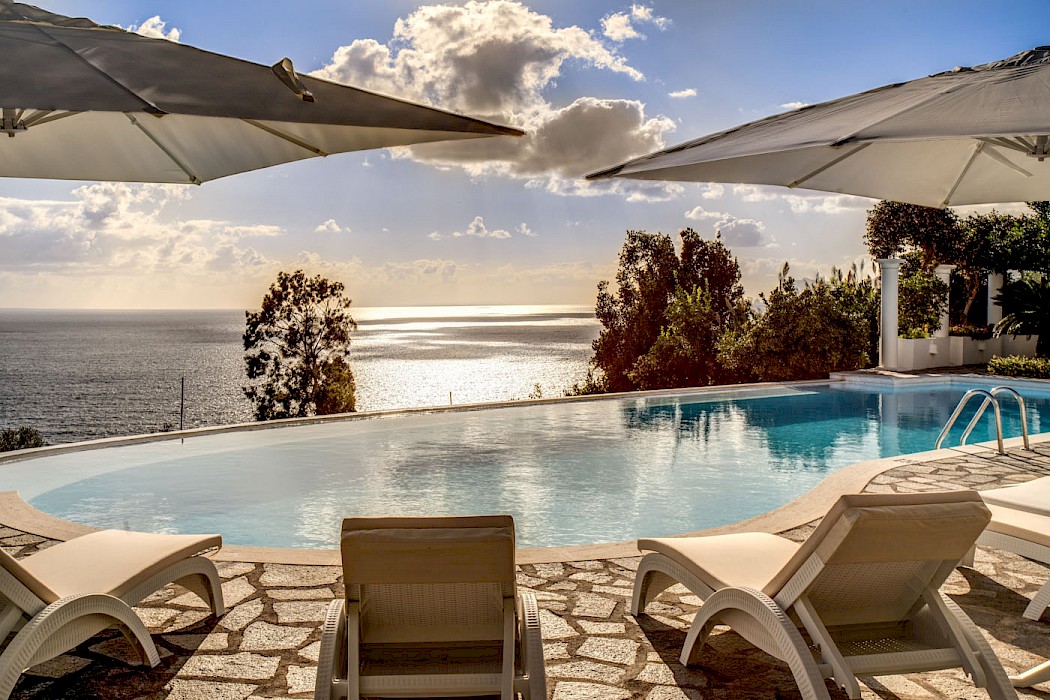 A generous terrace with outdoor living areas overlooks the coast and the shimmering open sea. The terrace features built-in stone benches, several gathering places with armchairs and coffee tables, a wood-burning pizza oven and barbecue. The villa’s lush garden includes a small lemon orchard which permeates the air with energizing citrus scent. The oversize free-form swimming pool (17 x 5.9 m), with ladder access, is 20 steps down from the ground floor. The villa is surrounded by a sun-drenched area furnished with comfortable chaise lounges, umbrellas and tables. The pool area is also provided with a small bathroom with outdoor shower and a changing hut.