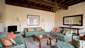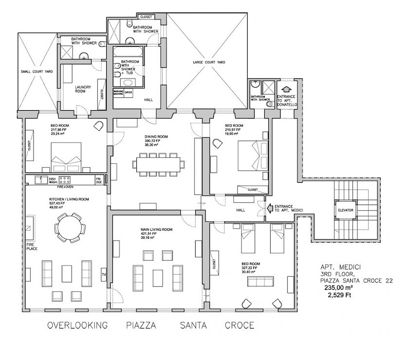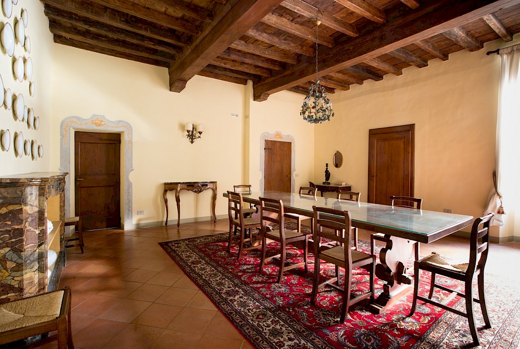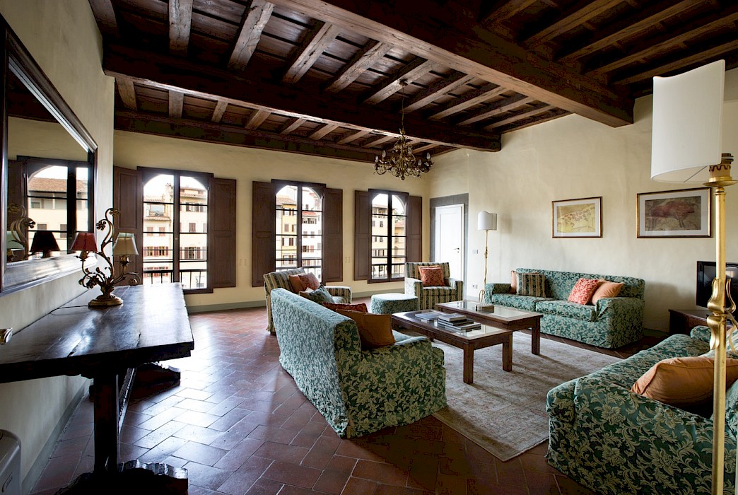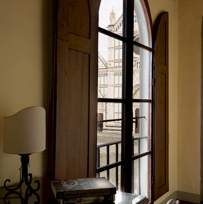 Entertain, relax, work and live on the majestic second floor of the palazzo, directly overlooking Piazza Santa Croce.. This elevator-accessible apartment boasts eight enormous floor-to-ceiling windows overlooking Piazza Santa Croce. The elegant and spacious living room opens into a fully equipped eat-in kitchen with working fireplace and room for eight; while the separate, formal dining room can seat up to twelve guests. Bedrooms lay behind a glass door with stunning views of the Piazza.