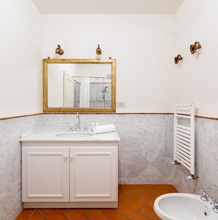 Apartment on one level in classical Florentine style (235 sq.mt - 2529 sq.ft), can host up to 6+1 people and offers 3 bedrooms and 4 full bathrooms. At the entrance a corridor leads on the right to the first bedroom with double bed(mattress 160 cm - can be divided) which has ensuite bathroom and direct access to the dining room. On the left in the corridor is the second bedroom with two single beds (mattress 90 cm - can be joined together) with double glazing windows overlooking the Square. Follows the dining room furnished with 12 seater table; here there is a door which leads to a small hall with direct access to the first and the second bathrooms: the first one has both bathtube and shower stall, the second bathroom has a shower with curtain. There is also a small laundry room.