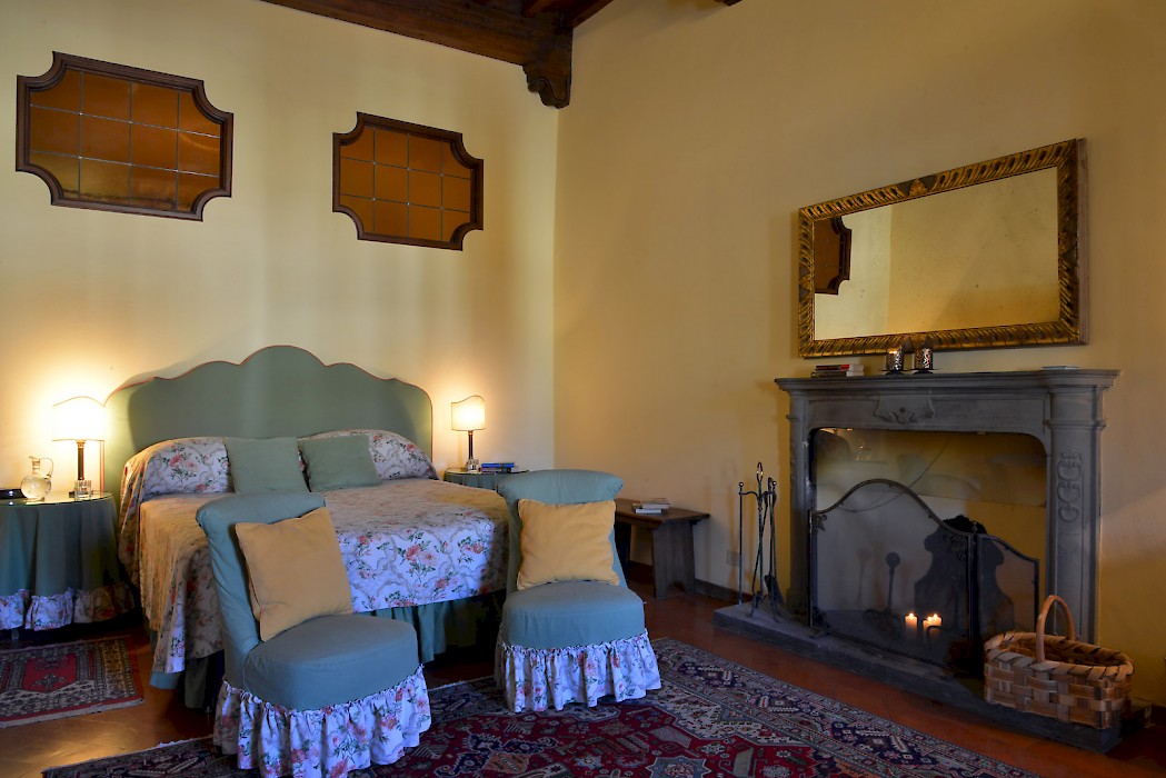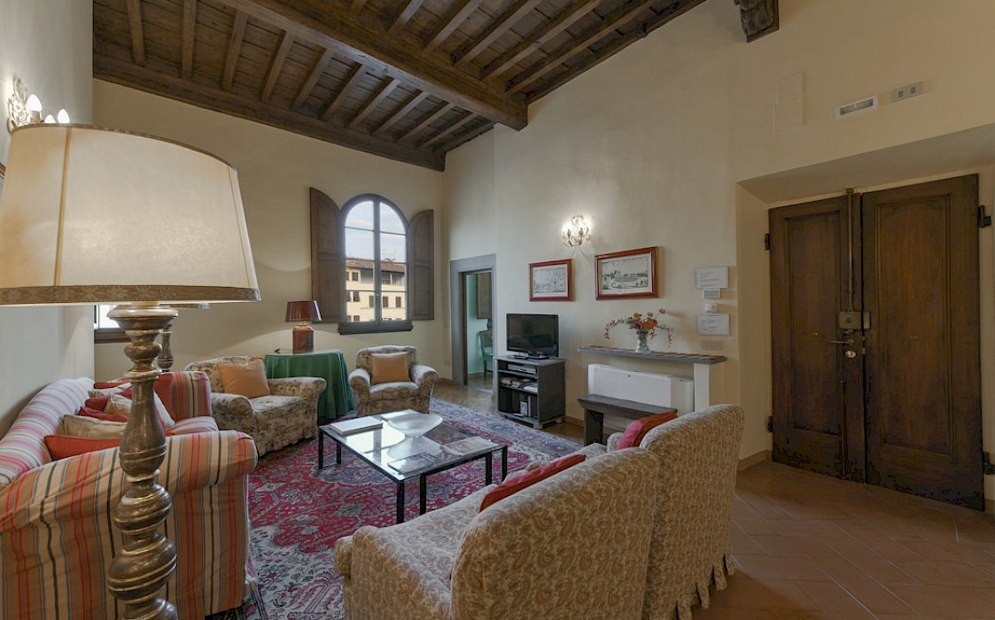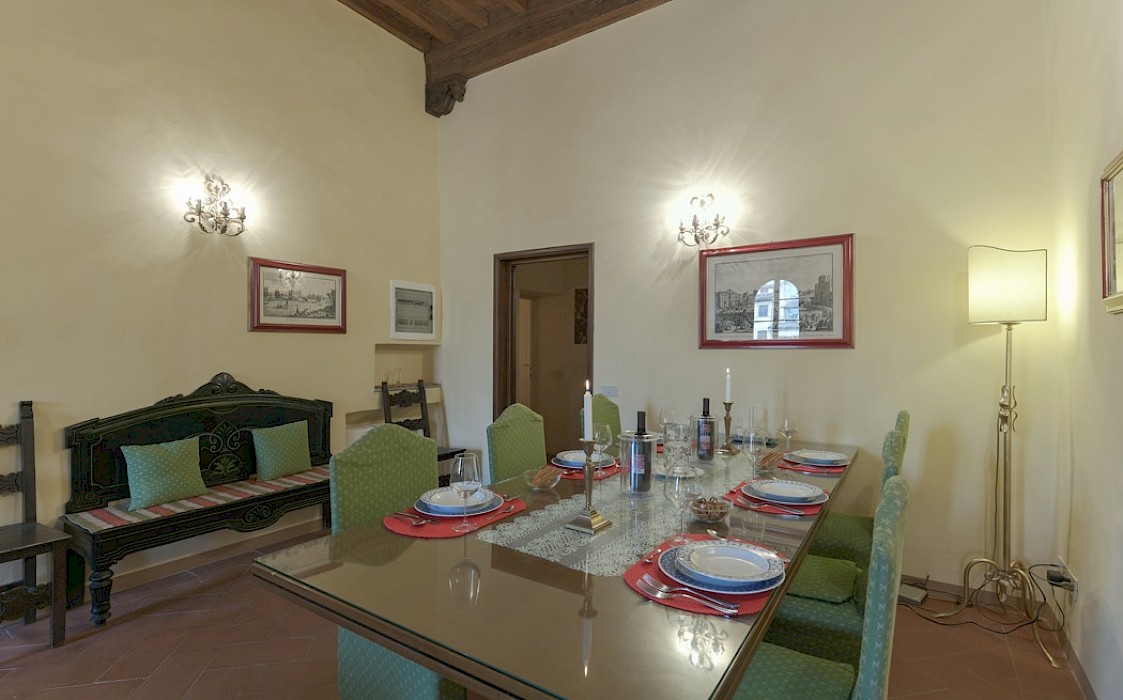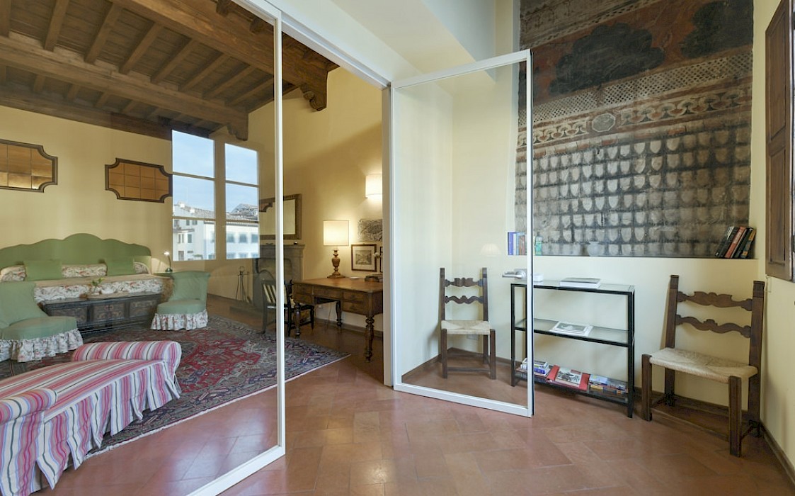 Located right on Piazza Snta Croce, six steps down from the elevator, this apartment features a romantic master bedroom with working fireplace and original 16th Century wood beam ceiling overlooking the square. Portions of ancient wall fresco add atmosphere to the spacious living room, and the dining area offers seating for up to 12 people.
