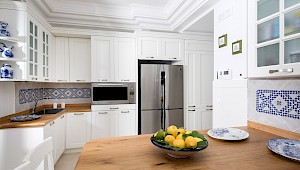 The glamorous white living room with dining area is bright and luminous thanks to two arched French glass doors, one of which faces the stunning furnished front patio. The curved lines in the upholstered furniture and the beautiful architectural details complement the classic style of the space. A well-equipped modern kitchen is adjacent and faces the terrace, making serving meals al fresco easy.