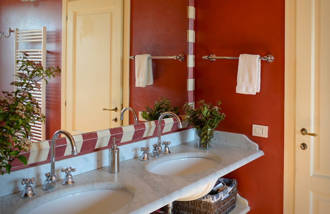The bright formal living room is comfortable and sophisticated thanks to its Persian rugs, original antiques and some family heirlooms, which bring an elegant feel and a personal touch to the room. Large French doors ensure this traditional room doesn’t feel stuffy and let you soak up the morning sun while enjoying the garden views. Media room features a large flat screen satellite TV, DVD and music system. Fully equipped kitchen to prepare informal meals. Office room provided with everything needed to work while away from your desk, if you really have to. Lower Floor: This floor’s open concept merges three rooms into a single space: the professional spacious and modern kitchen, the wine cellar offering a wide selection of Tuscan wine a la carte, and the formal dining room with a generous table that can sit in style up to 18 guests. The dining room has direct access to the outdoor space through French doors. Laundry room and staff private quarters complete this floor.