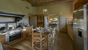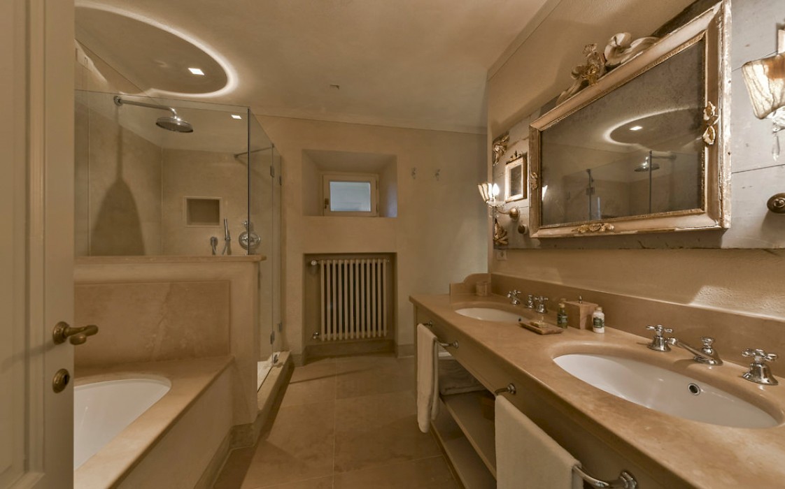The décor is upscale contemporary rustic, in the latest tones, woods and textiles. Light and airy the comfortable spacious living and sitting areas, with fireplace, are totally panoramic. Separate dining area with a table for up to 18 guests. Fully equipped and beautifully furnished Tuscan kitchen. 1 twin bedroom with en suite bathroom with double sink, shower and separate tub – this room is barrier-free.