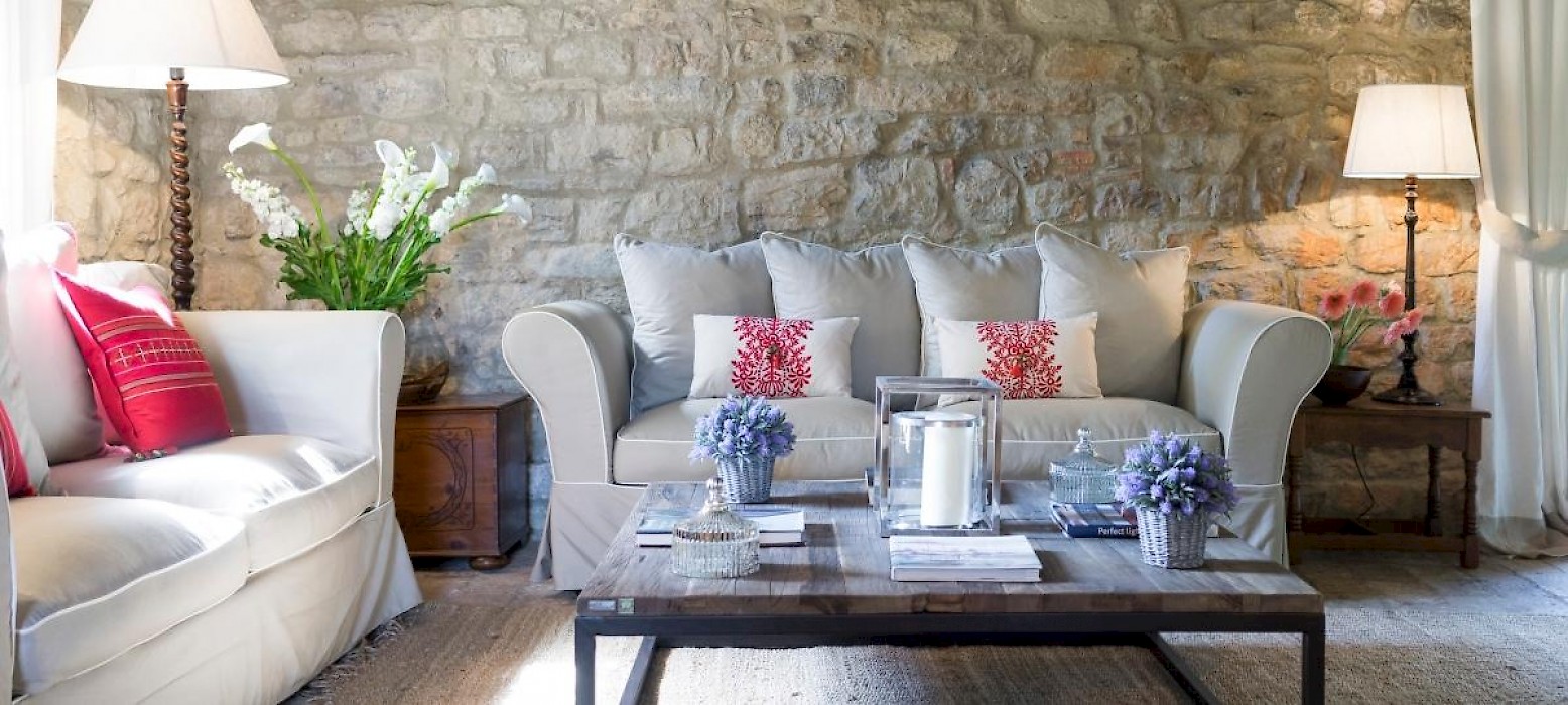 Enter into a spacious, open-plan living and dining room with working fireplace and featuring open-stoned walls. The dining table seats up to 8 guests. Charming kitchen with breakfast table and doors leading to gardens and external dining area. The pantry/laundry room features also a washing machine and fridge.
