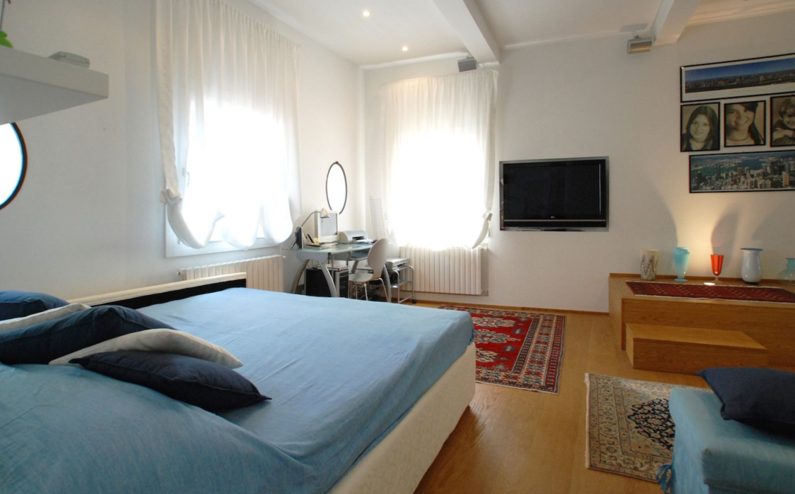 The living room gives access to a lovely small terrace and a well equipped high-tech kitchen. A corridor connects the living area with the bedrooms, the first of the two being rather small but nice, the second much bigger with plenty of storage space. The bathrooms are luxurious, the first with a large shower, the second with spa bath. The view from the living room of St. Mark's Bell Tower is nice and is a reminder of just how close you are to San Marco Square.
