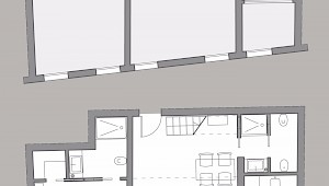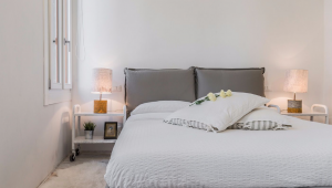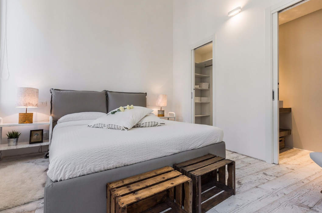It is composed of a generous size living room equipped with a comfortable sofa, some Danish design chairs from mid-20th century and a rustic table for four people, a stunning and very functional designer kitchen, a cozy double bedroom with walk-in wardrobe and en-suite bathroom, a second small bedroom accessible from the mezzanine in the living room and a second bathroom with shower. Please note that the smaller bedroom is reached through a staircase, has 1,5 meter high ceilings and is open on the mezzanine (there isn’t a door).