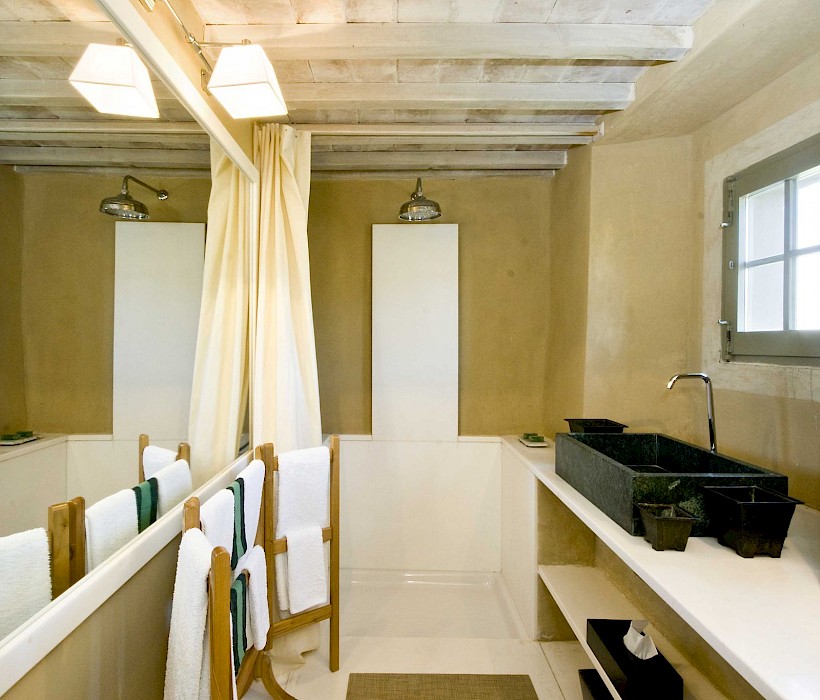 The first floor of the property is located up a flight of 20 steps. To the left of the staircase is a first master double bedroom with a stone fireplace, a built-in closet, and an en-suite bathroom with bathtub & extra-large shower head. The second double bedroom enjoys a small living room with T.V., en-suite bathroom with shower and a loft area, up a set of 12 steps, with a double bed and a set of twin beds (the loft sleeps 4 and is perfect for children). To the right of the staircase is yet a third double bedroom with built-in walk-in closet and en-suite bathroom with bathtub & extra-large shower head; a fourth double bedroom with built-in walk-in closet and en-suite bathroom with bathtub & large shower head; a twin bedroom with en-suite bathroom with bathtub & extra-large shower head and a second, master double bedroom with Baldachin bed and daybed window. This master bedroom enjoys a set of built-in closet and an en-suite bathroom with extra-large shower head.