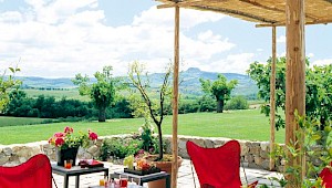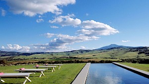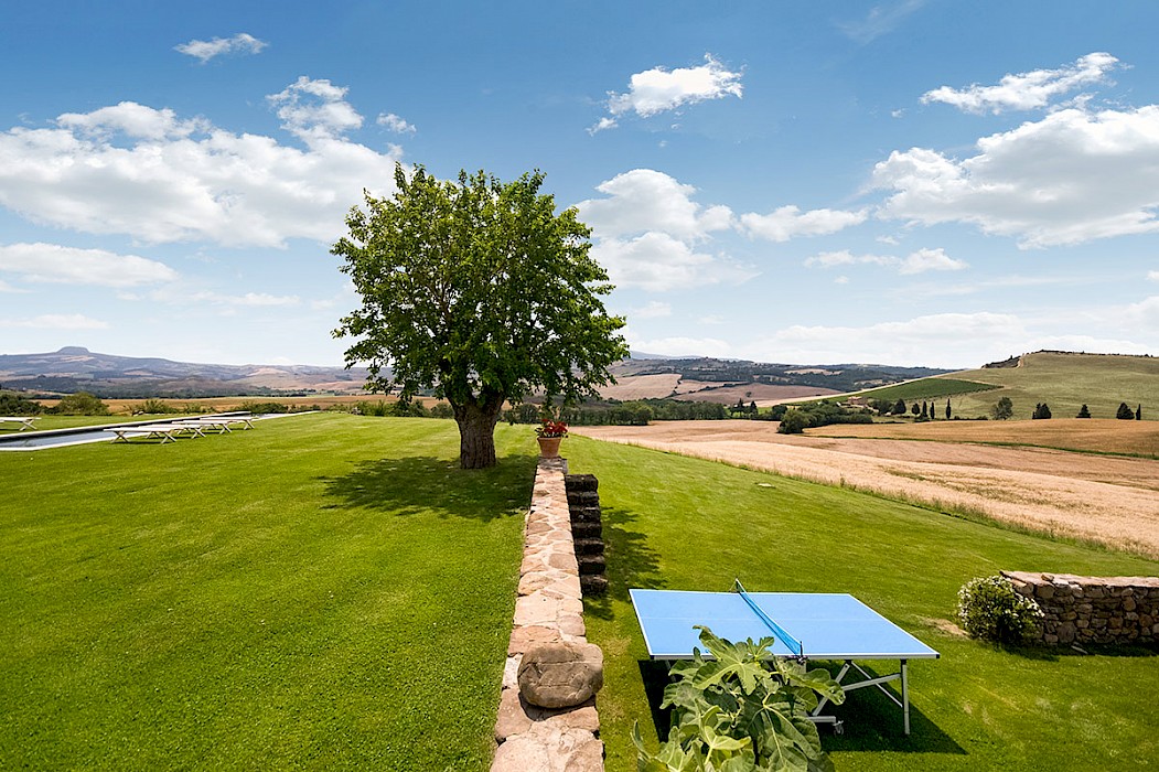 Located on a hilltop with stunning views of the Val d' Orcia. The villa has been completely renovated, maintaining the original features, but including state of the art facilities and a modern sophistication; the very best of Italian design. You will not want to leave the beautiful pool surrounded by three landscaped acres. Another beautiful feature is the sheltered dining patio for 20, with built in barbecue, and large brick wood burning oven for pizza or meats. Another stone patio is perfect for drinks at sunset.