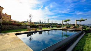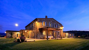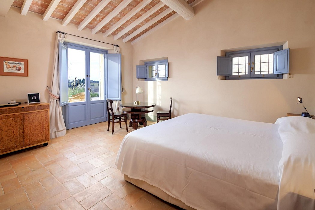 Guests will arrive via the Val d'Orcia, a region of naturally-sculpted ridges and tranquil hillsides that have been protected as a UNESCO World Heritage site. Entering the huge, sunlit driveway, the light-coloured stone and blue shutters of the farmhouse offer a vision of old-school charm. Ascend the exterior staircase to enter thoughtfully outfitted rooms, which are furnished with nod after nod to Italian styling, from the luscious leather furniture, to the craftsman-worked wooden tables and fittings, to the rich marble utilized in the home’s numerous and stylish ensuite bathrooms. Take in serene views of the quiet countryside from the beautifully-maintained garden that surrounds the home, stroll the expansive lawns and pathways adjacent to the house, or lounge in the poolside sun-recliners or covered dining area.