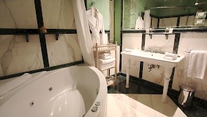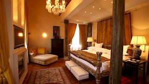 Bedroom 1; Royal Suite 10: 150 sqm, offers a history and elegance and is fit for any queen or king. A distinguished, superior king sized, hand-made silver matrimonial bed frame from India ornaments the suite, along with furniture and object d’art collected by the owner during his world travels. The spectacular size of the room (approximately 1600 square feet or 150 meters), combined with high ceilings and seven expansive windows, allows for a sun filled space during the day. Two fireplace and private dining area provide cozy corners to tuck into, and a magnificent bathroom with open Marble and Onyx Jacuzzi bath and luxurious walk-in shower and personal steam room add to the elegance of the overall effect.