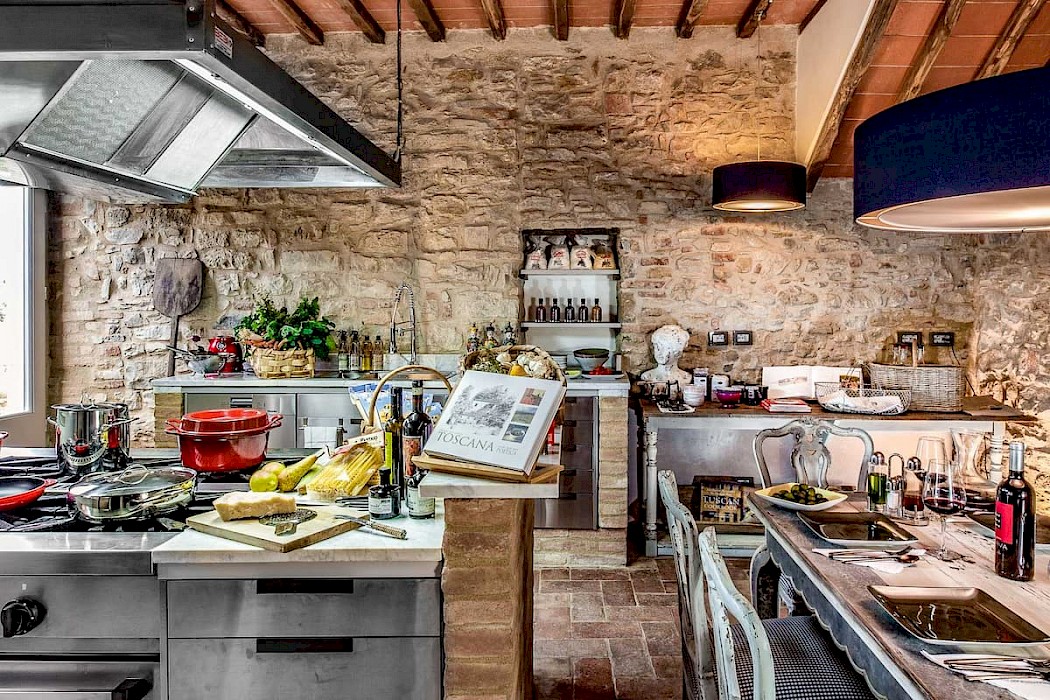 Vitigliano has all the authentic, elegant charm you’d expect from such a prestigious Tuscan villa. The exposed wood beams, natural stone accents, arched doorways, and brick ceilings show off the villa’s historic side, while designer furniture, high-end electronics, and stylish contemporary design display the luxuries of today. Vitigliano’s eight bedrooms are all outfitted with king-sized beds, en-suite bathrooms, and a separate sitting or living area.